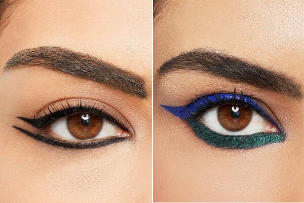 - Using colored liquid liner on the upper lash line or framing the eyes in different vibrant shades of blue, green, or more (right photo above)