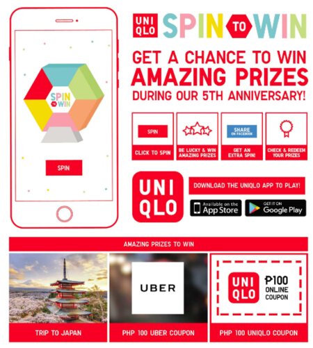 Using the Spin to Win mini-game (available only through the Uniqlo app), customers spin a wheel for a chance to win exciting prizes. Customers are entitled to spin once per day and can earn an additional spin per day by sharing the app on Facebook. Customers can also win Uniqlo and Uber coupons valued at P100, redeemable in the Spin to Win App, while one winner of a pair of return flights to Tokyo will be announced each week.